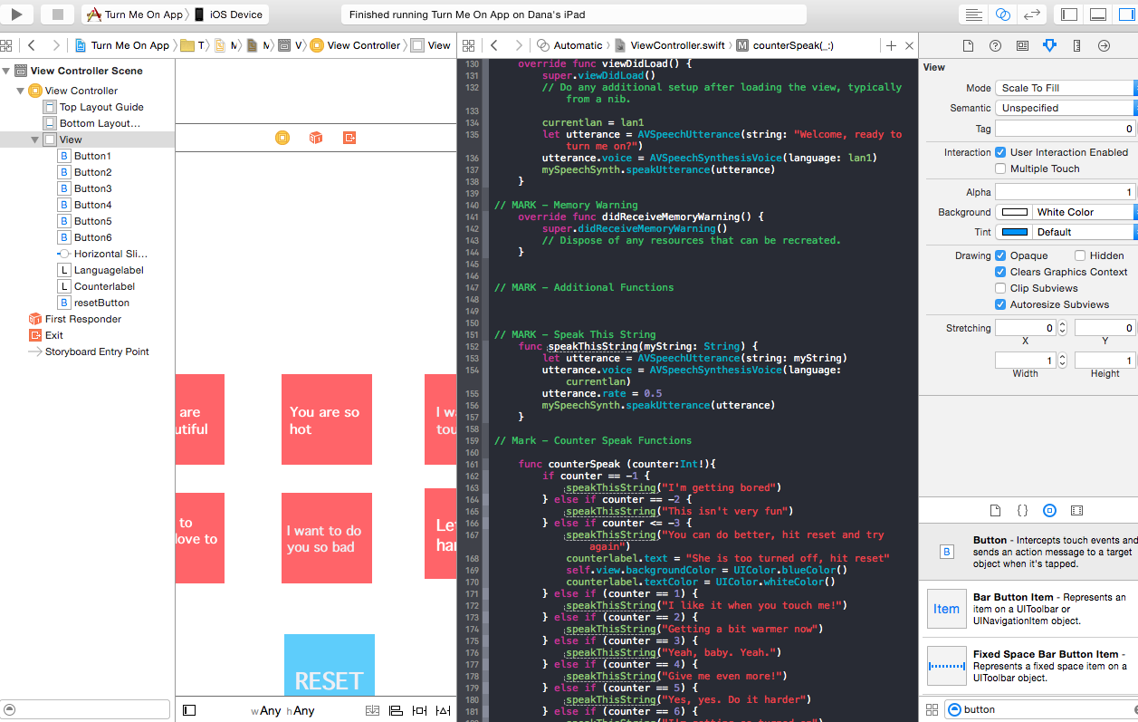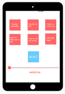 I have been listening to some podcasts on game design lately, and although this isn’t quite a “game” (or maybe it is since it has goals, and feedback?) I think that I’ve learned about that applies to Turn Me On is juice and the concept of circles squares and triangles. The game has goals (turn on the app) and feedback (the voice stimulus) but the feedback isn’t clear enough with the actions, the interface isn’t appropriate for how I want users to touch and feel the app (need more soft shapes and circles, curves), and the languages – although hilarious – don’t particularly make sense with the user experience.
