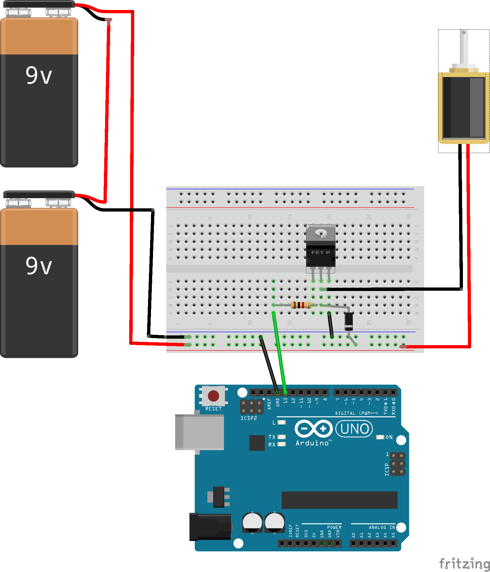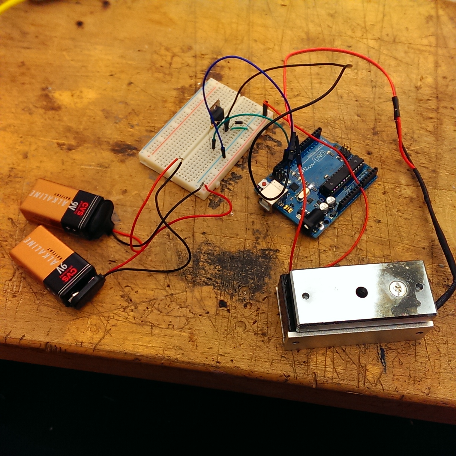 The basics of this is that you wire in the batteries to get a max voltage of 18v, plenty enough to power the lock. You then wire in a ground to your board, and a wire to pin 13, which will be used to control the lock. Then you connect the lock, but you have to use a transistor, a diode, and a resistor to get the current right so you don’t fry your Arduino board. I learned that the transistor 3 legs(from left to right) are B, C, E: Base, Collector, Emitter. I had to connect the output pin 13 to the base leg, using a 1k resistor to balance out the current. Then I connected the Emitter leg to the ground channel of the circuit. Finally, I connected the Base leg (middle leg) to the ground leg of the solenoid lock, and the power leg of the solenoid lock to the power that is running the battery.