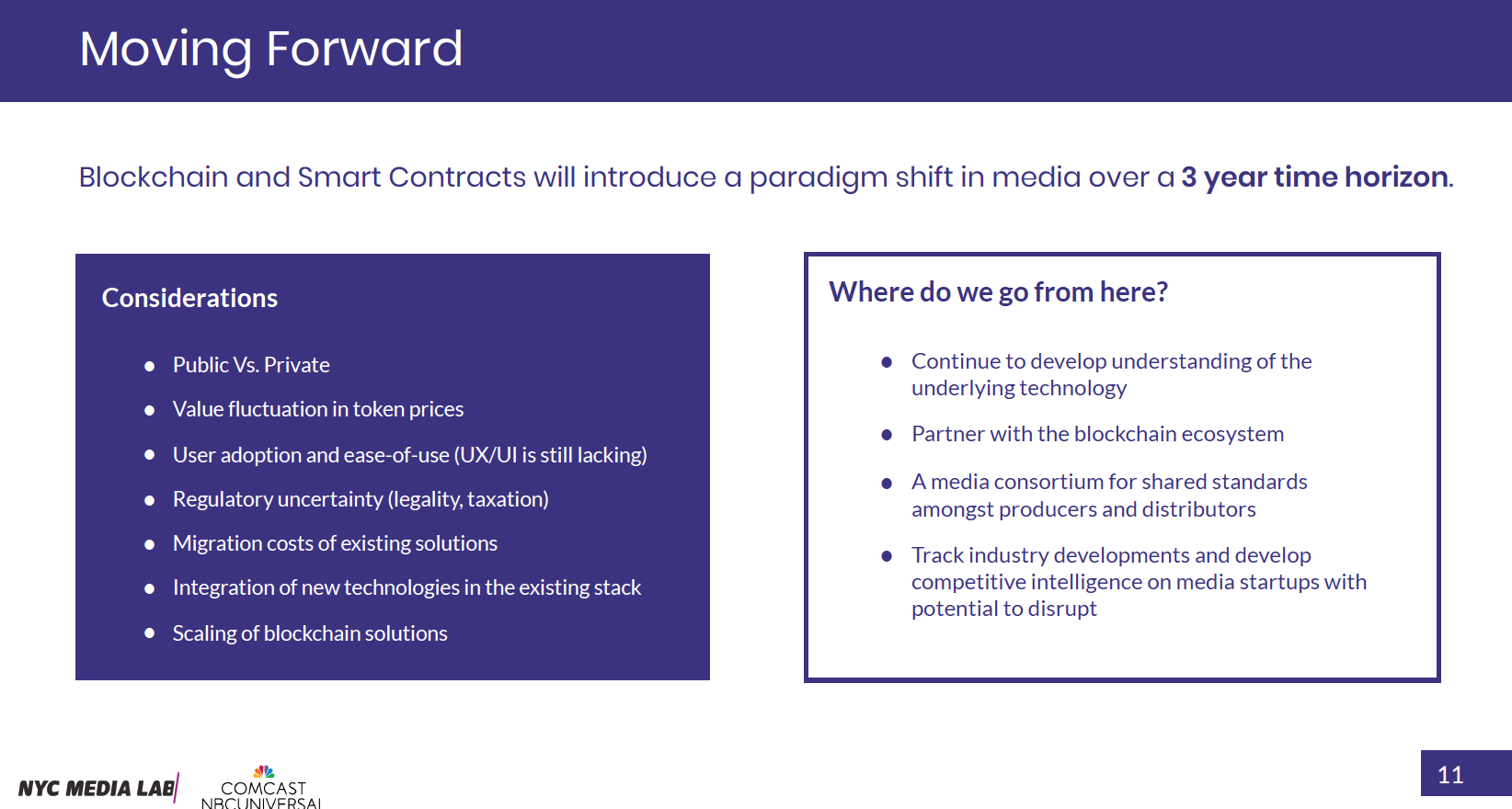 Both the prototype and research were compiled into detailed internal presentation for senior NBC technology and innovation staff, focusing on the possibilities and challenges of implementing blockchains in a larger media environment, what opportunities could be sought in the short, medium, and long-term, and what considerations NBC and other media companies should take into account as the technology matured.