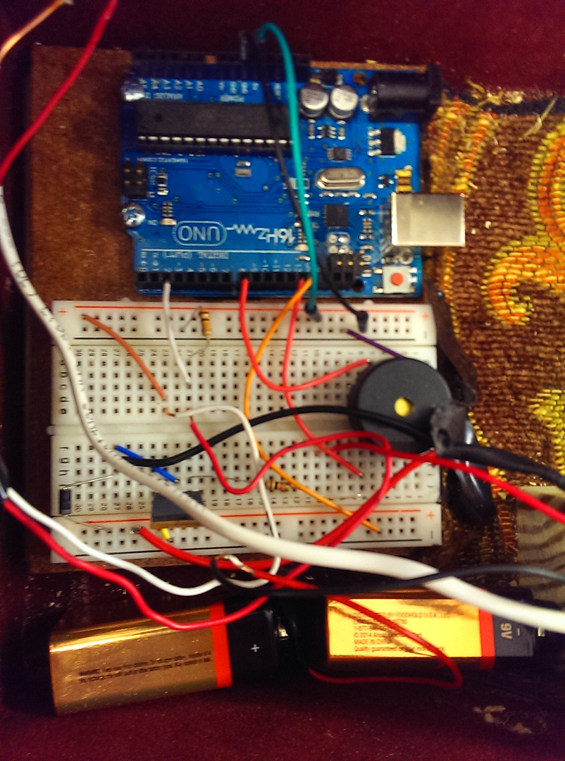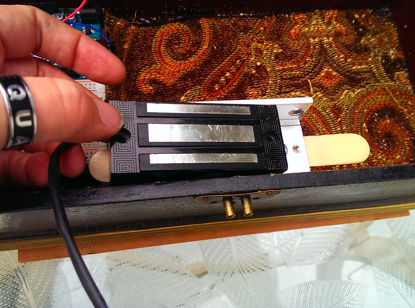 This project features a controlled commercial electromagnetic security lock and sensor components as well as a piezo for sound. The chest was reclaimed and repurposed from the garbage and restored for this project as per my design goal to reuse as many materials as possible during my tenure at Parsons.